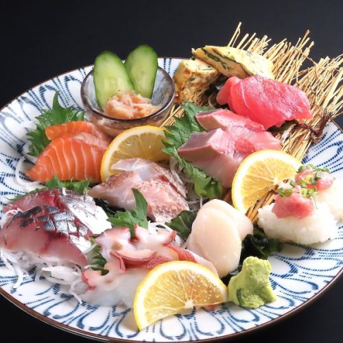 ☆オーダー率70%超えのお刺身七点盛り。珍味、寿司、出し巻き玉子の盛り合わせです。2人前~でお願いします。 ※画像は2人前になります